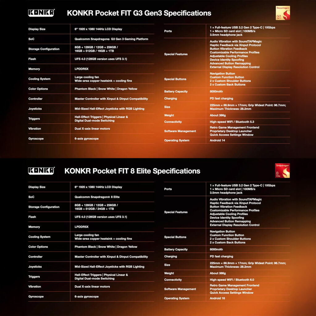 The KONKR Pocket FIT is more than just an Android gaming handheld; it is a comprehensive, no-compromise entertainment system built for the serious gamer. With its choice of flagship-level processors, high-refresh-rate display, professional-grade controls, and robust software customization, this device stands at the forefront of portable gaming technology, inviting you to experience the true potential of mobile gaming in a stunning new light.